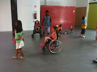 Depois do almoço estava calor na sala e os miúdos (principalmente o JP) acusavam cansaço e julgo que a professora, apercebendo-se, improvisou e foi para o ginásio fazer uma brincadeira que envolvia imensos conceitos de noção corporal, números e também regras de comportamento….e o JP passou o tempo todo a rir, muito muito divertido.